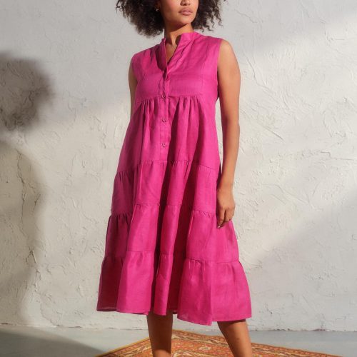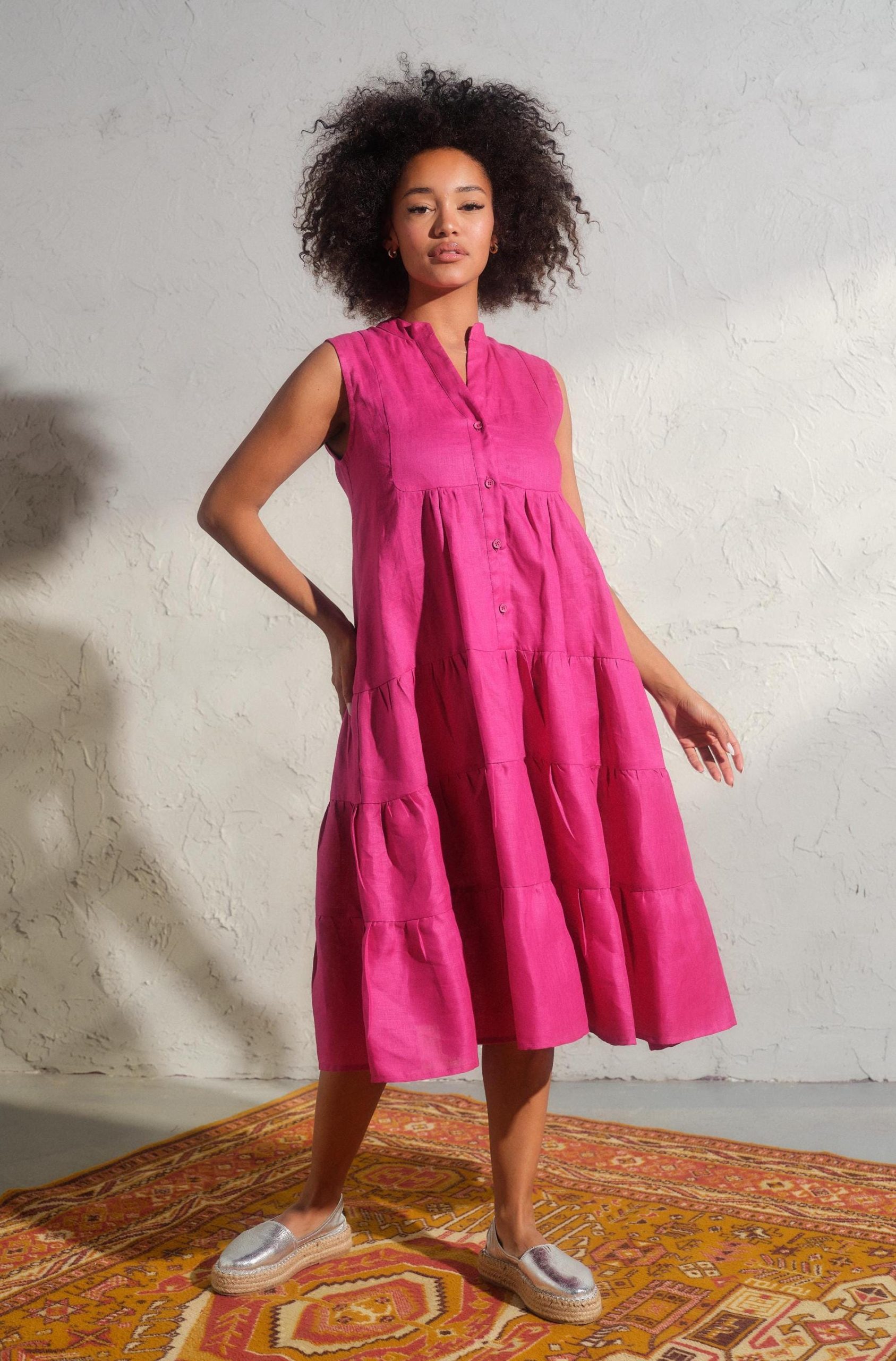 Designed with a below-the-knee length, it features a flattering A-shape silhouette, a V-neckline with buttons, and practical pockets. The sleeveless design and loose fit ensure maximum comfort in warm weather, while its versatile style pairs beautifully with espadrilles, sneakers, or sandals for a variety of occasions.