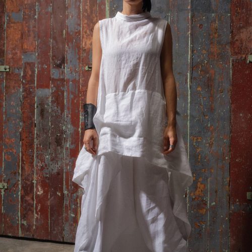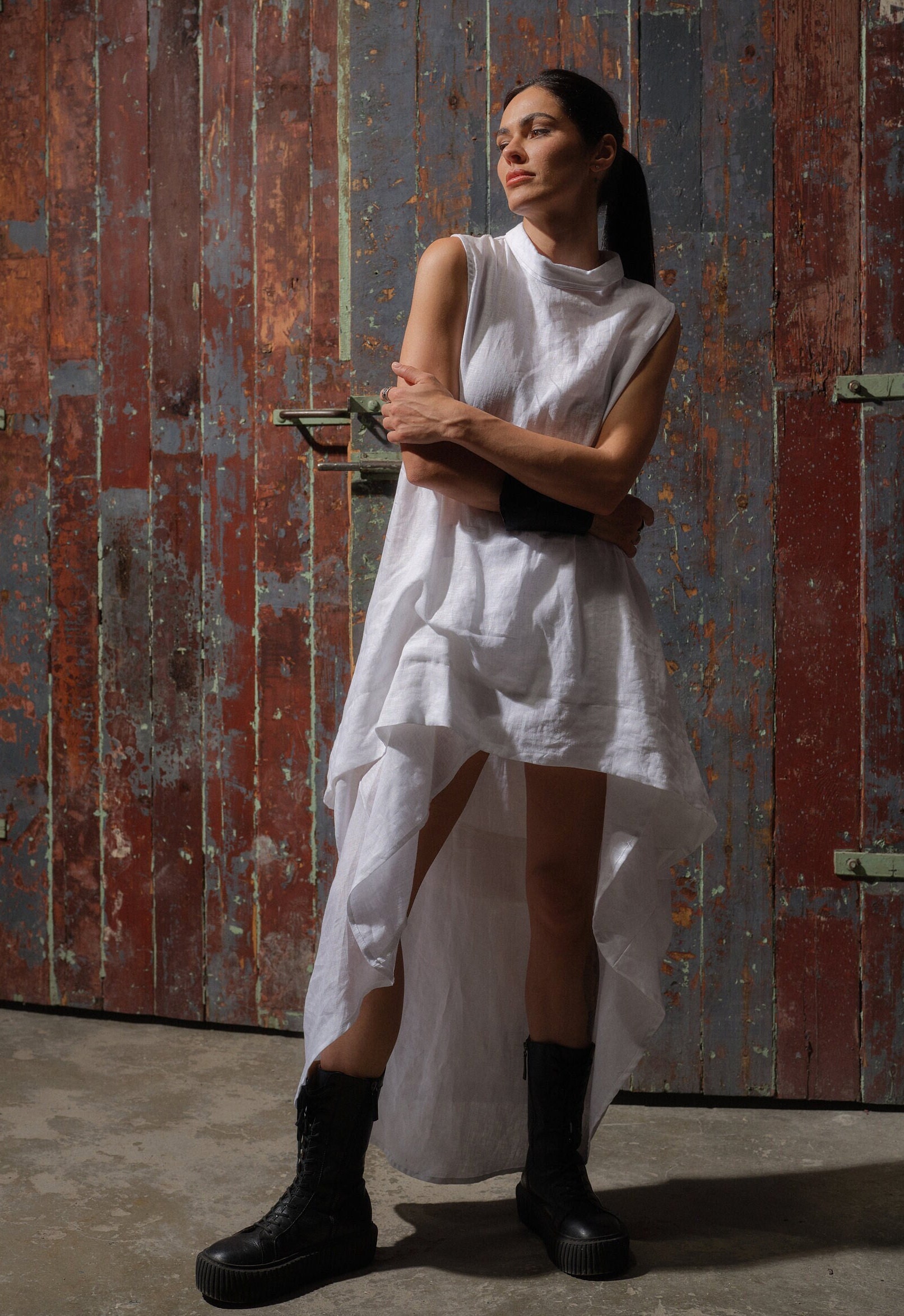 The white summer linen dress is an extraordinary avant garde piece, featuring shorter asymmetrical front that flows down your back, creating beautiful waves.