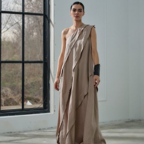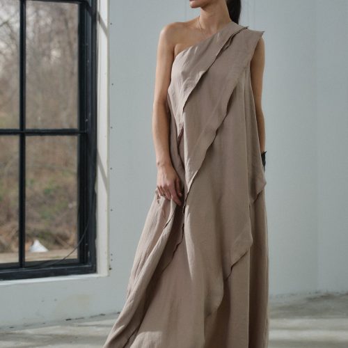 Beige Linen Maxi Dress One Shoulder Asymmetrical Ruffle